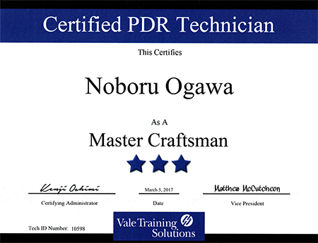 デントリペア国際技術者ライセンス制度(VALE)の取得は非常に難関な資格であり、世界最高峰の資格「Master craftman(マスタークラフトマン)」の資格取得者は日本国内でわずか13名しかおりません。